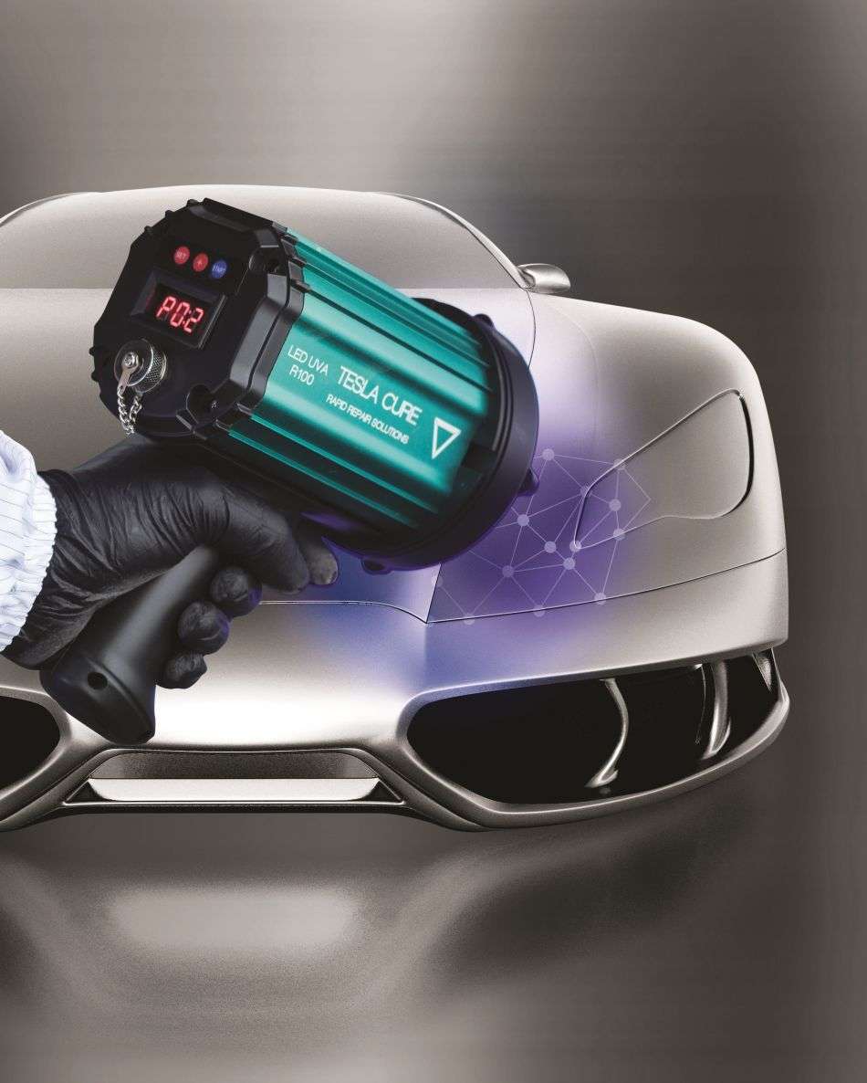 La TeslaCure R100 est une lampe à main portable et rechargeable basé sur la technologie LED ultraviolette pour effectuer des réparations rapides avec des produits UV, comme l’Autosurfacer UV.